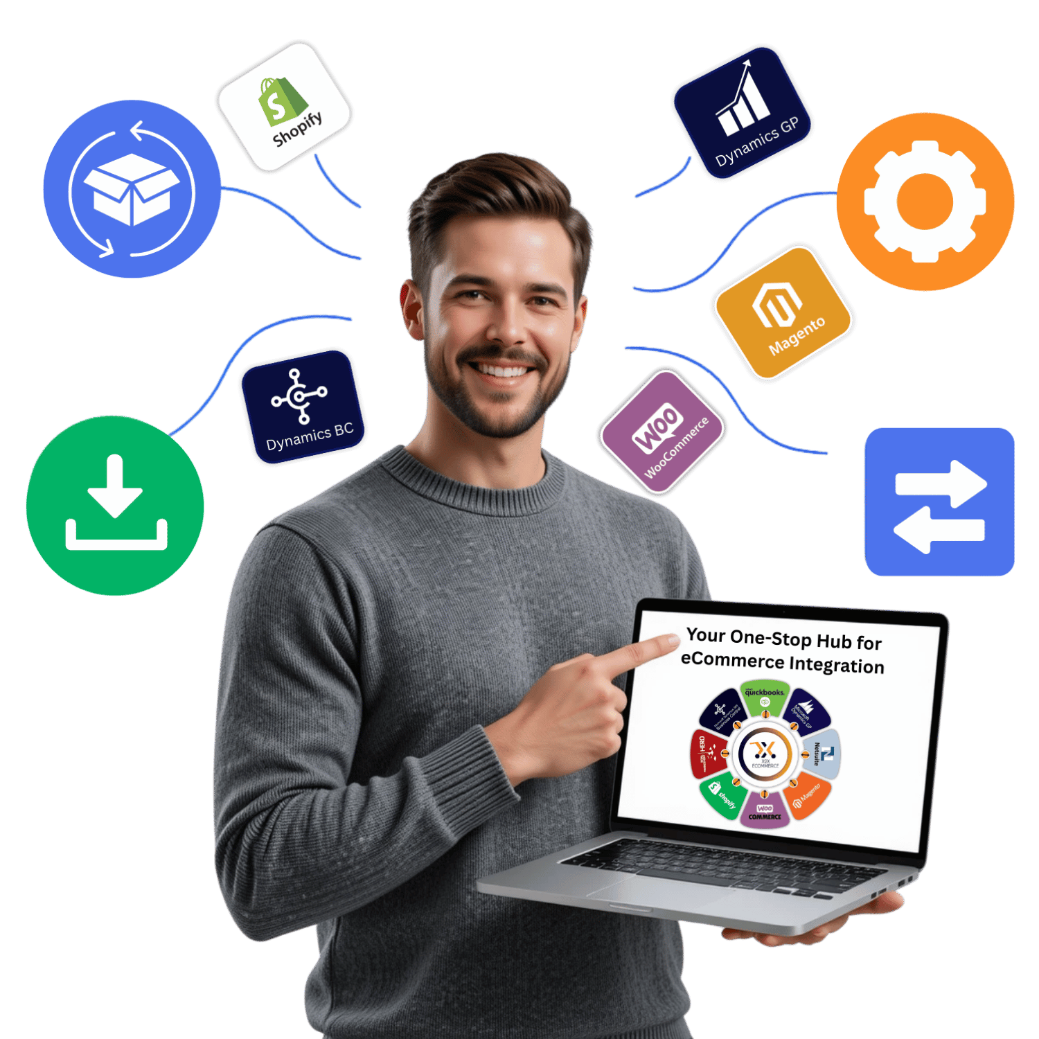 Sync your store with RMH (Shopify, WooCommerce, Magento) and ERP systems (Dynamics GP/365, QuickBooks, NetSuite).